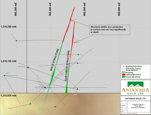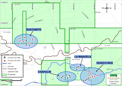 September 27, 2010, Calgary, Alberta: Antioquia Gold Inc. (TSX-V: AGD) Antioquia is pleased to announce continued success of the drilling program and the latest drill results from the 5 hereto unreported holes on its Guayabito Prospect at the Cisneros Gold project in Colombia (PC10-33 through PC10-37). Additional sampling is continuing to further define the rock characteristics adjacent to the main mineralized structures needed to define resource calculations and mine design parameters. Figure 1 shows the location of all the prospects drilled to date on the Cisneros Project.