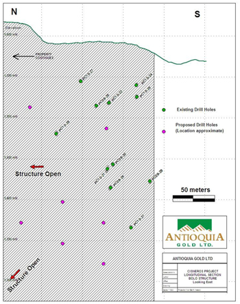 Logan Drilling has been contracted to complete the remaining footage of the previously announced 10,000m drilling program for 2010. The drilling will focus on defining the Bolo and Guayabito structures to the north and to depth. Figure 3 is a longitudinal section on the Bolo structure showing where existing drill holes intersect, and proposed drill holes are anticipated to intersect, the structure. Details of these intersections can be found on the website at www.antioquiagoldinc.com.