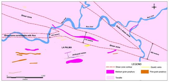 - La Palma Brownfield Exploration: A new surface exploration program at the La Palma area is currently under way with encouraging results. A Nus-type shear zone has been identified over a strike length of more than 4.0 km and up to 400 meters thick (see Figure 1). A diamond drilling program is necessary to understand the behavior of this structure at depth and to establish how it could be incorporated in the future La Palma mining operation.� The drilling program will be a significant component of the detailed, follow-up exploration plan for La Palma.