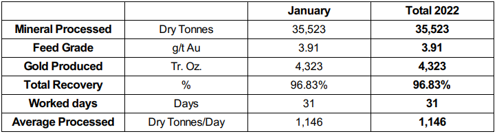 During January, 4,323 troy ounces of gold were produced at the Cisneros mining operation. An average of 1,146 tonnes of ore per day were processed, with a recovery of gold to concentrate of 96.83% during the month.