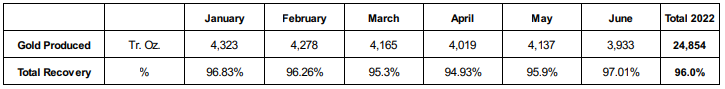 During June, 1,715 tonnes of third-party ore with an average gold grade of 12.83 g/t were purchased from third parties, representing 17% of the monthly gold production.