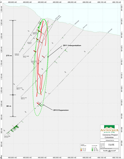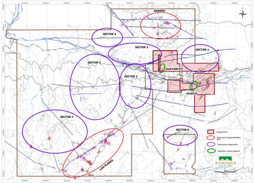 Regional exploration of 9 identified targets at the Cisneros project continues in order to define drill targets to be tested in 2013. Field work is comprised of geological mapping, prospecting and soil geochemical profiles. The Cisneros property regional exploration program is an integral part of Antioquia Gold’s future as it is designed to confirm the potential and the extent of multiple gold occurrences on the Cisneros property.