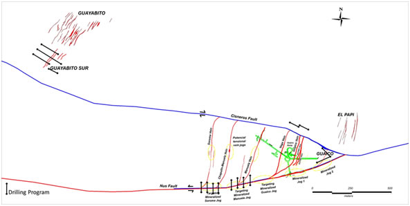 The drilling program will explore the NUS structure with eight drill holes moving roughly 700 meters to the west of previous drilling, intersecting the previously defined Manuela, Soroma, and Chapulin-Manuela Veins. The Guayabito System will be explored with four drill holes. A new vein system will also be tested at Guaico near the intersection of the NUS and Cisneros faults. See Figure 1