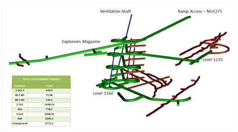 - 986 meters of Main Ramp developed at level 1160, 115 meters below main access