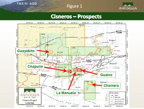The Cisneros Project consists of 7 contiguous mineral dispositions covering 5,522 hectares. The property is located geologically on a large granodiorite intrusive called the Antioquia Batholith, where mineralization is structurally controlled. The Cisneros Project is comprised of the Guayabito Property covering 178 hectares, the La Manuela Property covering 101 hectares and the Santo Domingo lands (formerly called Grupo de Bullet lands).