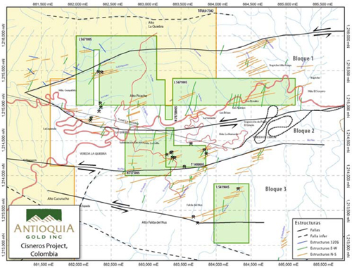 The Cisneros Project is located 70 kilometers northeast of the city of Medellin in the Department of Antioquia, Colombia. It consists of 6 contiguous mineral dispositions covering 279 Ha plus 5,243 Hectares controlled under a LOI with Grupo de Bullet (Figure 1). The property is located geologically on a large granodiorite intrusive called the Antioquia Batholith, The geologic model has been defined as a structurally controlled mesothermal lode/vein type system. This system appears to be laterally continuous, and dominated by gold with various secondary precious metals and sulphides, specifically silver, copper and molybdenum. The Cisneros property has been the primary focus of AGD’s exploration activities to date consisting of surface soil and rock geochemistry, structural and alteration mapping, as well as mapping and geochemistry of historic artisanal mine workings in the area. There are at least 20 historic artisanal mines in the area where locals extracted high grade vein gold for over 100 years.