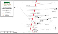 October 20, 2011, Calgary, Alberta: Antioquia Gold Inc. (“Antioquia Gold” or “the Company”) (TSX-V: AGD; OTCQX: AGDXF) is pleased to announce the discovery of a second vein system in the footwall of the Guaico structure at its Cisneros Project in Colombia. Drilling also continues to define the primary structure at Guaico along strike and to depth. Significant intersections in this recent round of drilling include:
