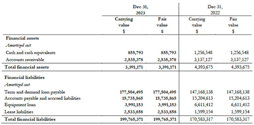 The Company’s objective when managing capital, defined as its shareholders’ equity plus term and demand loans and lease payable in the amount of $ 91,402,089 (December 31, 2022 – $ 87,971,682), is to safeguard its ability to continue as a going concern, and to pursue the development of its properties. The Company manages its capital structure and makes adjustments to it in light of changes in economic conditions and the risk characteristics of the underlying assets and seeks to retain sufficient equity to ensure that cash flows from assets will be sufficient to meet future cash flow requirements. In order to maintain or adjust the capital structure. the Company may from time to time issue shares and adjust its capital spending. To assess capital and operating efficiency and financial strength. the Company continually monitors its net cash and working capital. The Company’s capital management objectives, policies and processes have remained unchanged during the year ended December 31, 2023.