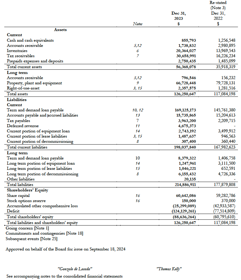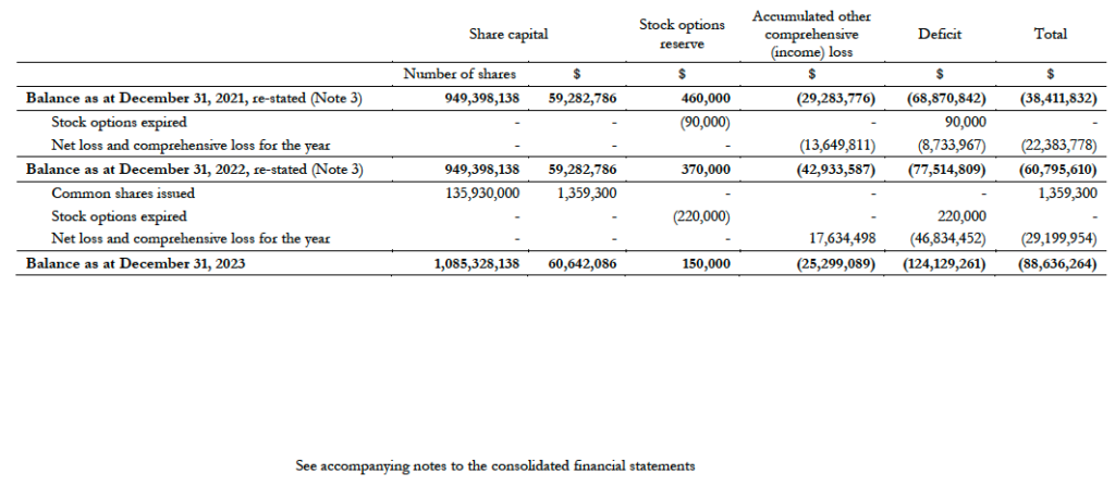 These consolidated financial statements have been prepared using IFRS Accounting Standards applicable to a going concern, which assumes continuity of operations and realization of assets and settlement of liabilities in the normal course of business for the foreseeable future, which is at least twelve months from December 31, 2023. At December 31, 2023, the Company had a cumulative deficit of $ 124,129,261 (December 31, 2022 $ 77,514,809), and a working capital deficit of $ 141,669,762 (December 31, 2022 – working capital deficit of $ 132,064,304). The Company’s ability to continue as a going concern is dependent upon its ability to achieve profitable operations, generate sufficient funds and/or continue to obtain sufficient capital from investors to meet its current and future obligations. The recoverability of amounts shown for property and equipment is dependent on future profitable operations or proceeds from disposition of mineral interests. As a result of these risks, there is material uncertainty which may cast significant doubt as to the appropriateness of the going concern assumption. There can be no assurance that the steps management is taking will be successful. These consolidated financial statements do not reflect the adjustments to the carrying values of assets and liabilities and the reported expenses and consolidated statements of financial position classifications that would be necessary if the going concern assumption was inappropriate. These adjustments could be material.