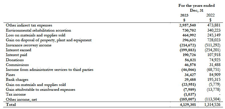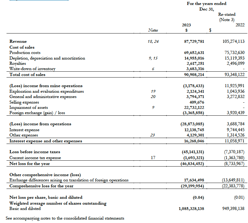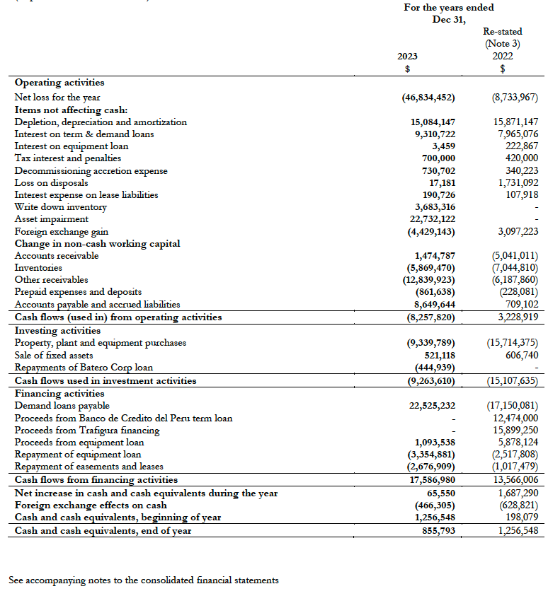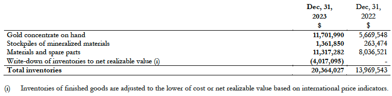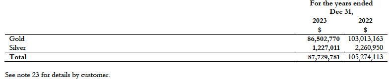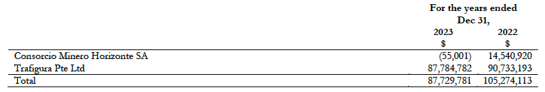 - The Company sold gold concentrate in the amount of $Nil (US$ Nil) (December 31, 2022 – $14,540,920) to Consorcio Minero Horizonte SA.