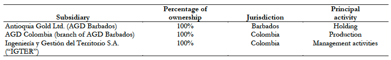 Antioquia Gold Inc. (“Antioquia” or the “Company”) was formed by way of amalgamation on April 25, 1997 and continued under the laws of British Columbia on March 24, 2016. The registered address of Antioquia is 2800 Park Place, 666 Burrard St., Vancouver, BC, V6C 2Z7. The Company is listed on the TSX Venture Exchange (“TSX-V”) under the symbol “AGD”. The Company trades on the OTCQX pink sheets, under the symbol “AGDXF”.