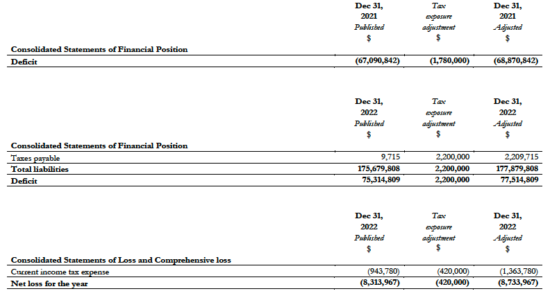 Uncertain tax provisions arise in the normal course of business and in the interpretation of tax legislation with regard to multinational structures. During the year, the Company recognized uncertain tax provisions of $700,000 (2022- $Nil). The Company does not have any material unresolved tax matters or disputes with the tax authorities.