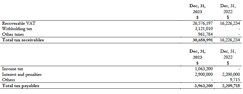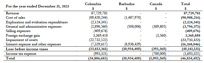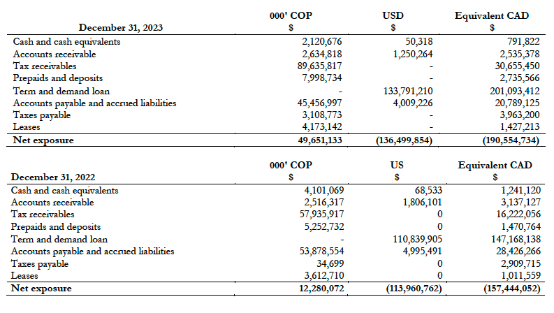 As at December 31, 2023, the Company has Colombian non-capital losses of $Nil. (2022 – $18,830,022). In 2022 this non-capital losses were applied against Colombian taxable income in 2022.