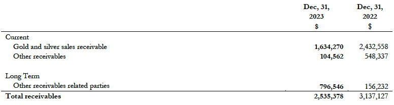Other current receivables are related to a claim of a loss of concentrate theft $Nil (December 31, 2022 – $ 200,968) and equipment sold to Bancolombia with the purpose of carrying out a leaseback $Nil (December 31, 2022 – $ 337,832).