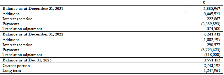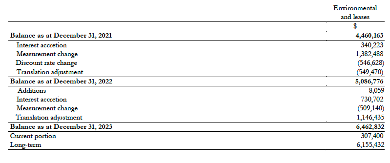 The Company is committed to a program of environmental protection and has estimated its total decommissioning costs on its Cisneros project to be approximately $6,490,969. The Company discounted the environmental provision and decommissioning costs to its net present value of $6,454,773 at December 31, 2023 using a discount rate of 10.06% over a three year period (December 31, 2022 – 12.83%). The obligation is expected to be paid out in the year 2026.