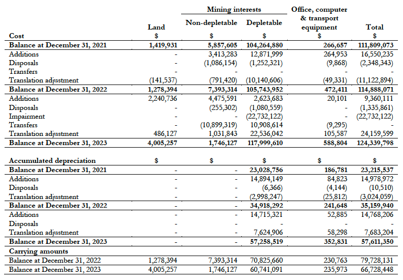 During the year ended December 31, 2023, the Company recognized impairment losses of $22,732,122 (2022: $nil) related to Property, Plant and Equipment, including mining properties, fully allocated to the mining segment and reported under “Impairment of assets” line in the consolidated statements of loss and comprehensive loss.