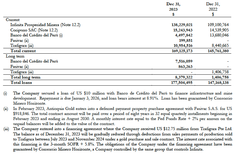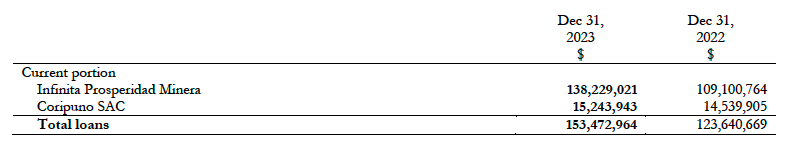 - The total term and demand loans and interest thereon at December 31, 2023 amounts to $138,229,021 (US$ 104,513,096) (December 31, 2022 – $109,100,764). The total loans plus interest are unsecured, denominated in US dollars, bear interest at 10%.