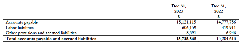 - The total term and demand loans and interest thereon at December 31, 2023 amounts to $15,243,943 (US$ 11,525,740) (December 31, 2022 – $14,539,905). The total loans plus interest are unsecured, denominated in US dollars, bear interest at 7.13% and are due on demand.