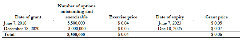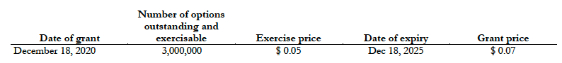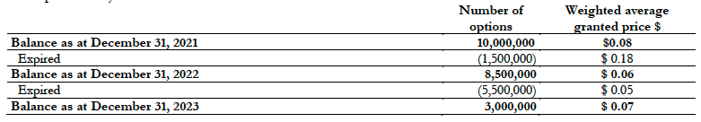 During the year ended December 31, 2023, the estimated grant date value of the 5,500,000 expired. Options in the amount of $220,000 was transferred from the option reserve to deficit. During the year ended December 31, 2022, the estimated grant date value of the 1,500,000 expired. Options in the amount of $ 90,000 was transferred from the option reserve to deficit.
