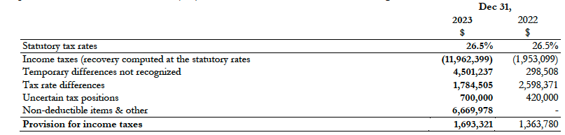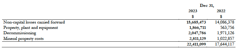 As at December 31, 2022, the Company has Canadian non-capital losses of $10,068,256 (2021 – $9,696,803) that have not been recognized and may be carried forward and applied against Canadian taxable income of future years and begin expiring in 2026.