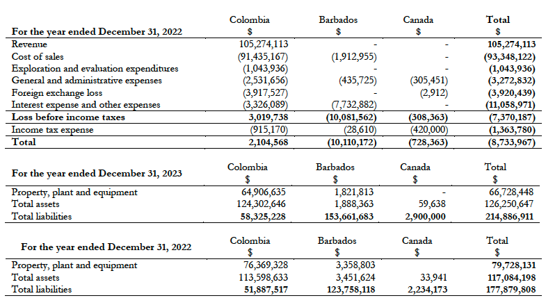 The Company has one operating and reporting segment in mining which operates in one geographic area – Colombia and is listed in Canada. The Company’s revenue by location of operations and information about the Company’s assets by location are detailed below: