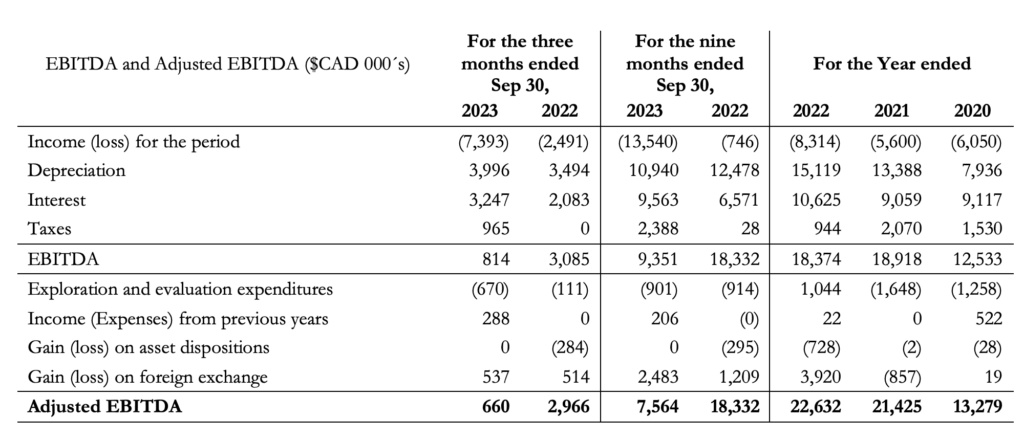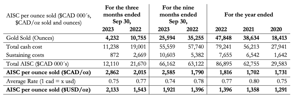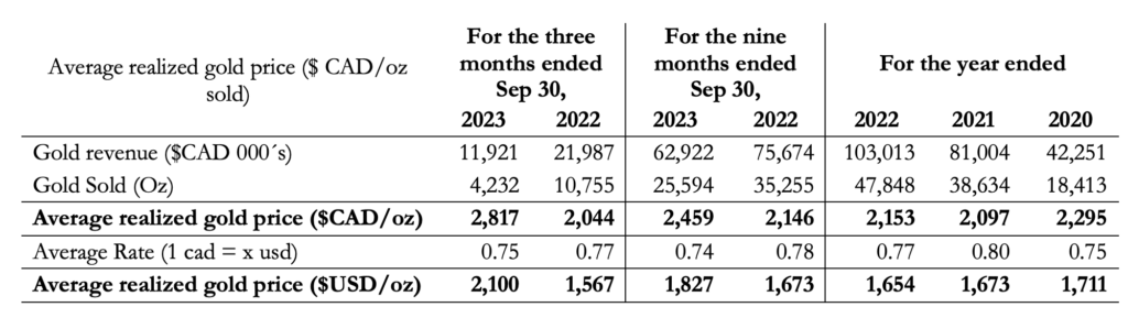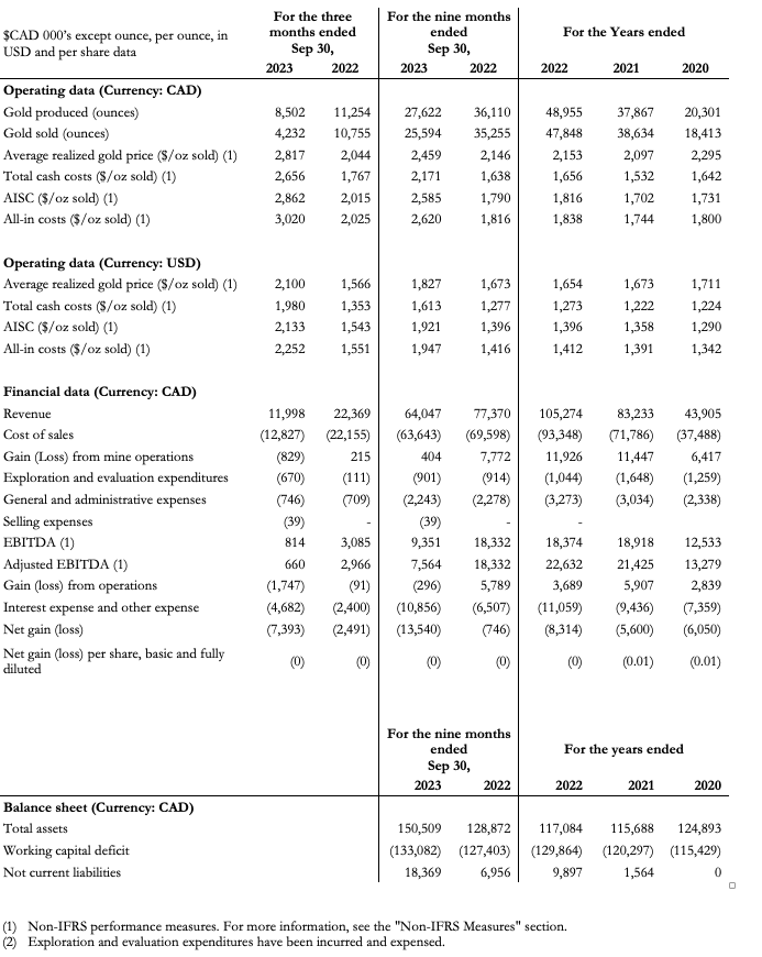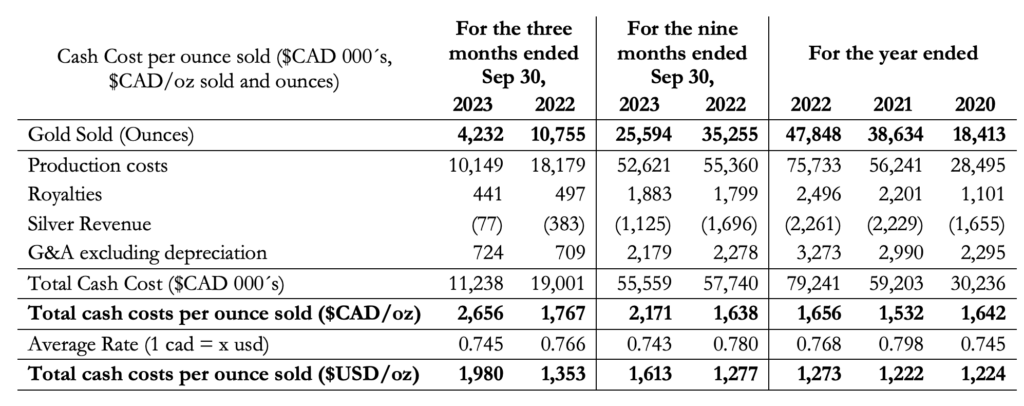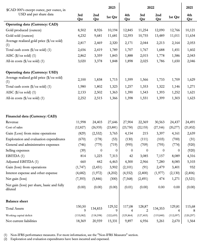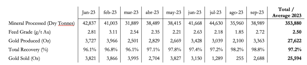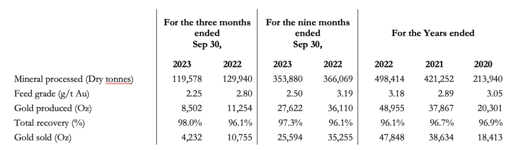 A total of 8,502 ounces of gold were produced during Q3 2023 compared to 11,254 ounces of gold during Q3 2022. During Q3 2023 the plant processed 119,578 tonnes compared to 129,940 tonnes in Q3 2022. Gold grades decreased in Q3 2023 to 2.25 grams/tonne from 2.80 grams/tonne in Q3 2022.
