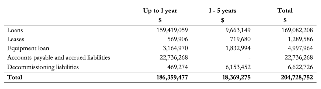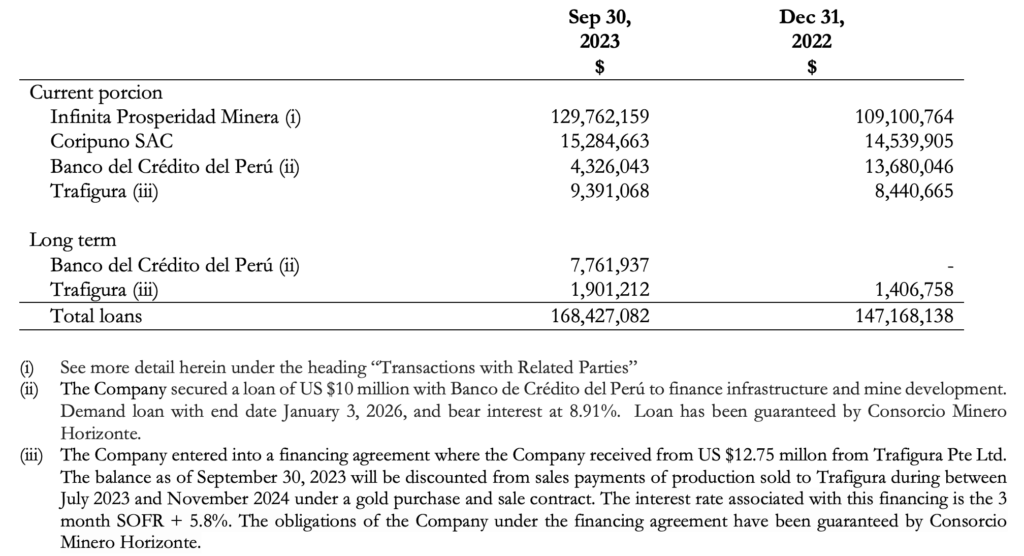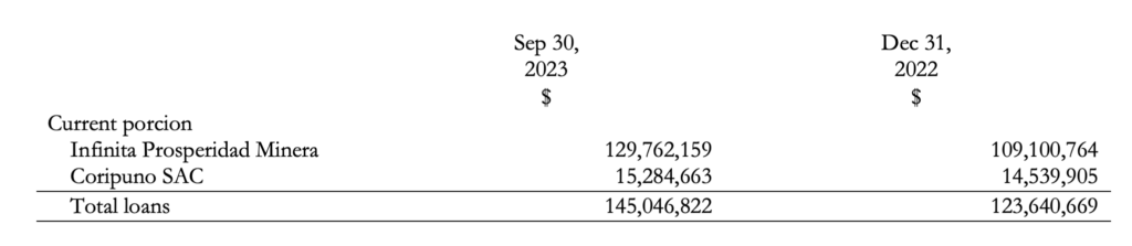 • The total term and demand loans and interest thereon at September 30, 2023 amounts to $129,762,159 (US$ 95,977,931) (December 31, 2022 – $109,100,766). The total loans plus interest are unsecured, denominated in US dollars, bear interest at 7.13%.
