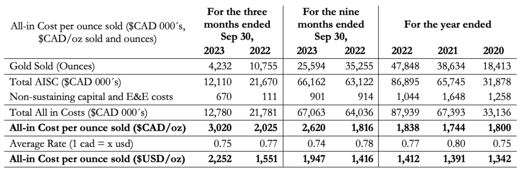 The Company reports All in Cost on a per ounce sold basis.