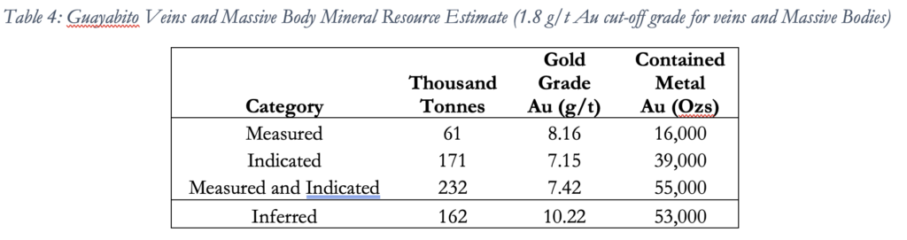 • Domains were modelled in 3D to separate mineralized rock types from surrounding waste rock.  The domains were modelled based on quartz veining and structural interpretations of the vein geometries. At Nus and the massive bodies at Guayabito, a probability assisted constrained kriging (PACK) method was used to further constrain block grade estimates.