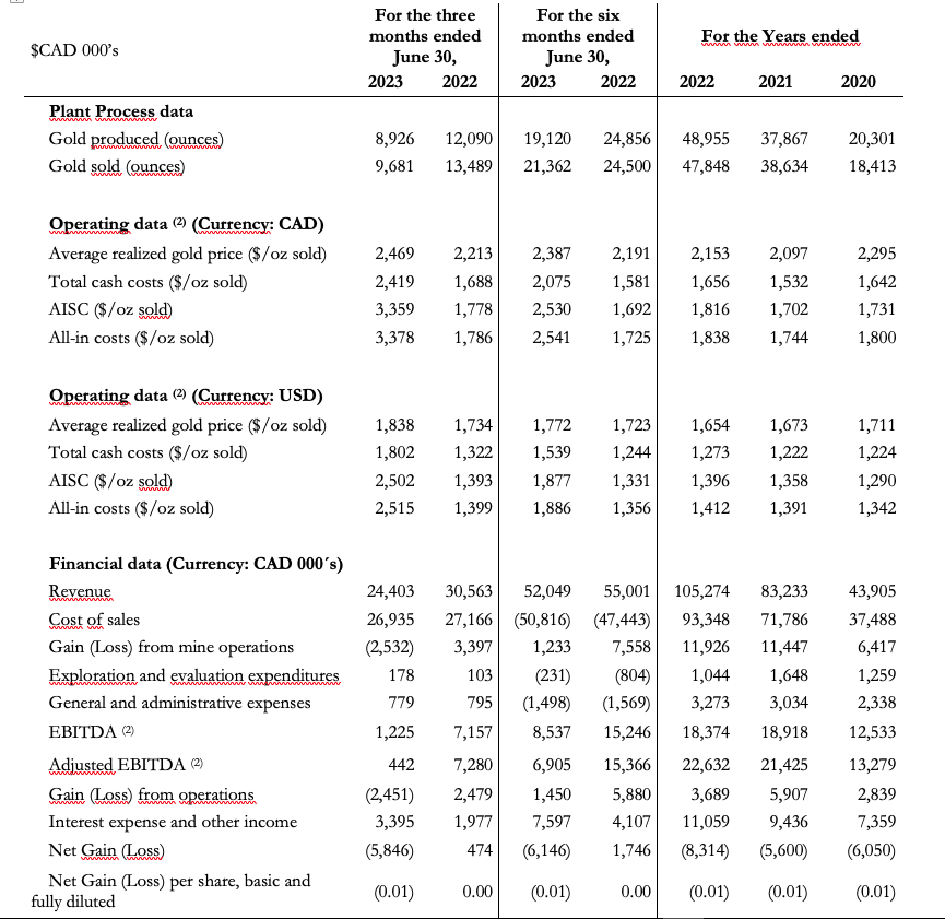 (2) Non-IFRS performance measures. For more information, refer to the definitions of EBITDA, Adjusted EBITDA, Average realized gold price, Cash Cost, AISC and All-in Cost in the “Non-IFRS Measures” section of the period ended June 30, 2023 MD&A.